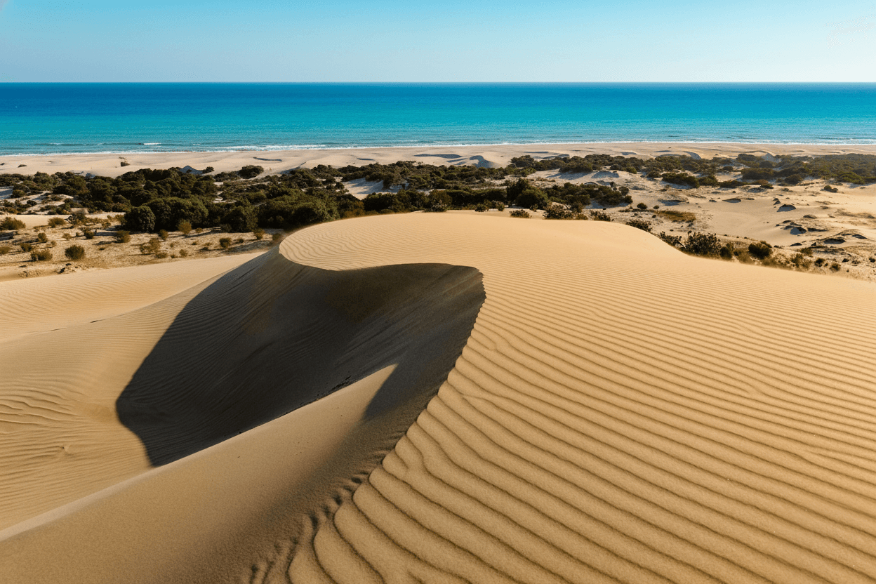 Дикий песчаный пляж с ослепительными дюнами протяженностью 18 километров, граничащий с развалинами древней Ликийской столицы, родиной Николая Чудотворца.